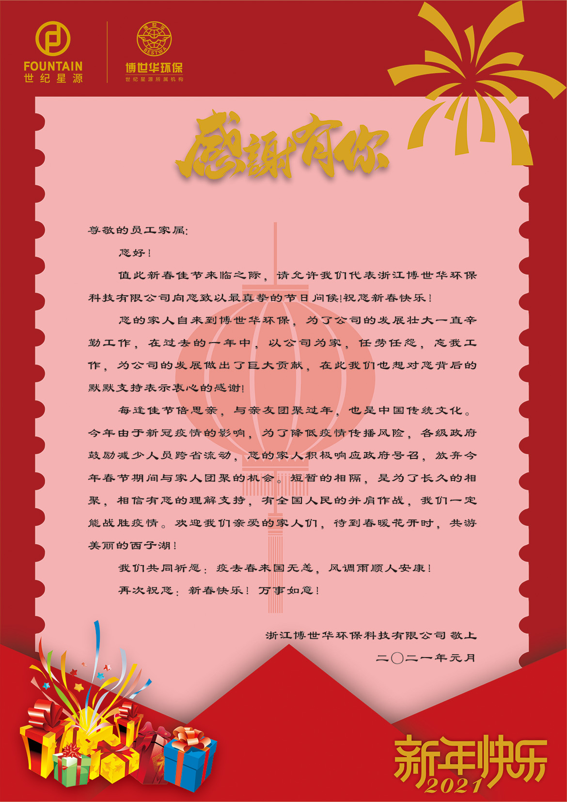 送“祝福”:博世華環保通過慰問信、微信拜年等方式,向在杭、在項目過年的員工及家屬致以親切慰問,提供更為細致周到的人文關懷。